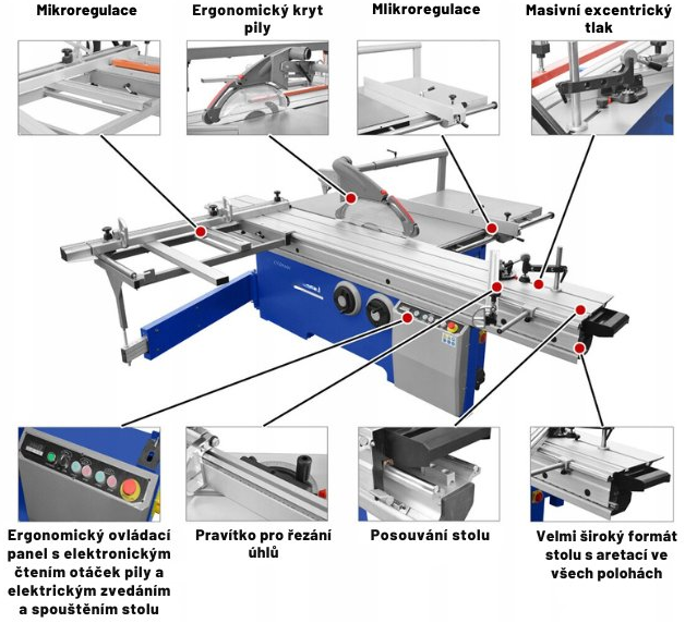 - Pokročilá pilová jednotka: Pilová jednotka je vybavena patentovaným naklápěcím segmentem a automatickým zvedáním kotouče, což umožňuje kombinaci hlavního pilového kotouče o průměru od 250 mm do 350 mm s předřezovací jednotkou o průměru 125 mm.