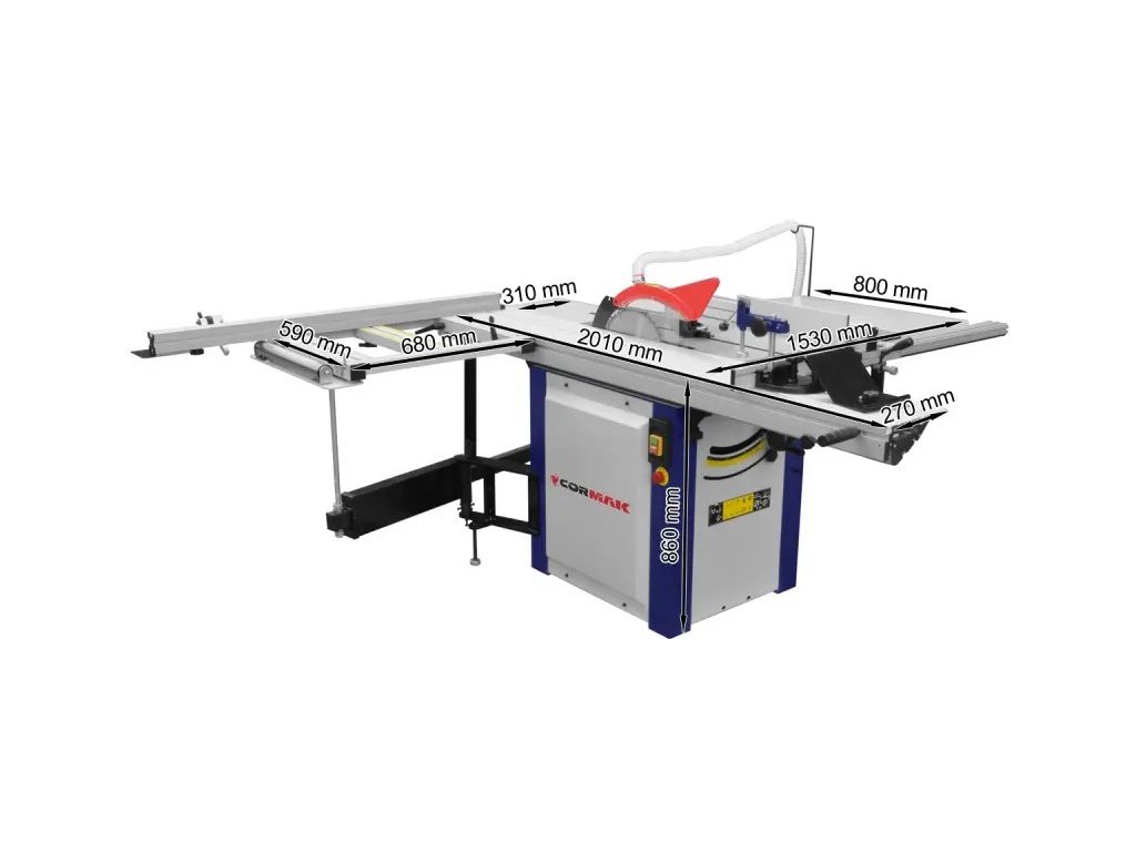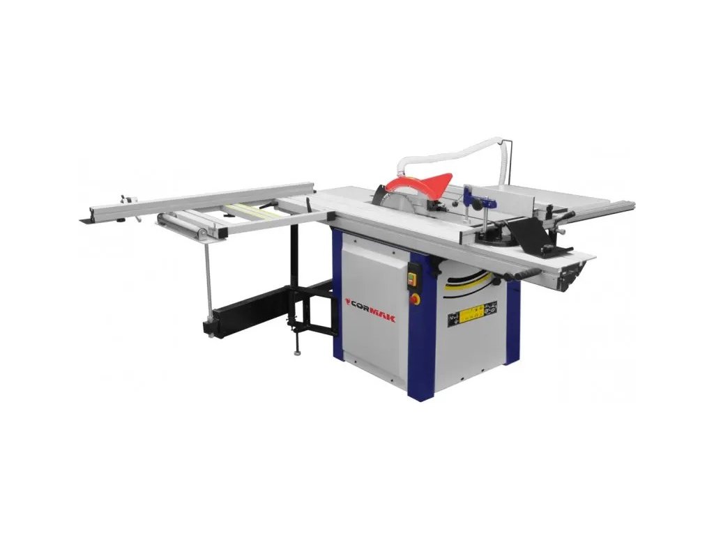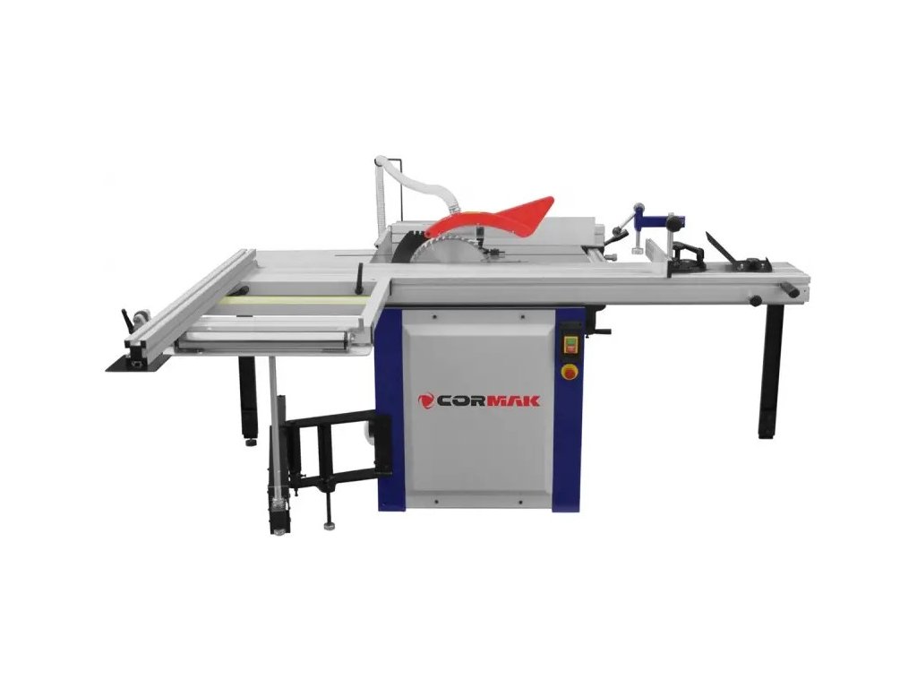 - Nastavení výšky kotouče: Formátovací pila Cormak s předřezovacím zařízením nabízí plynulé nastavení výšky řezné pily až do 100 mm, což umožňuje přizpůsobení se různým tloušťkám materiálu.