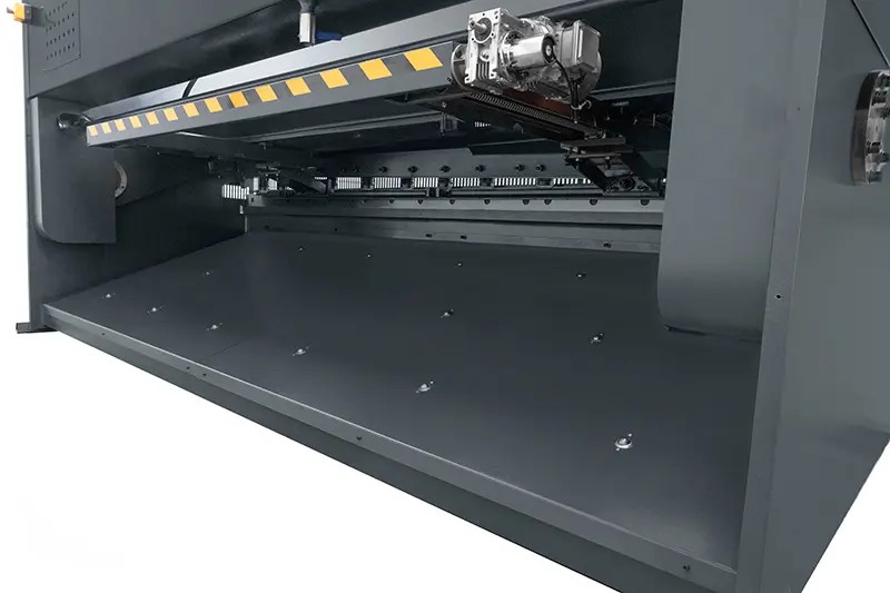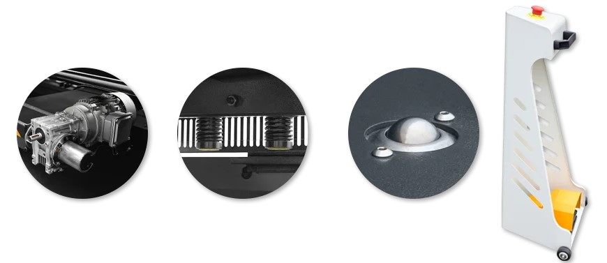 Zadní rampa je vybavena kuličkovými vedeními, která zajišťují plynulý a přesný pohyb řezaných prvků. Díky tomu na stroji nezůstává žádný úlomek materiálu, což zvyšuje efektivitu a bezpečnost práce.
