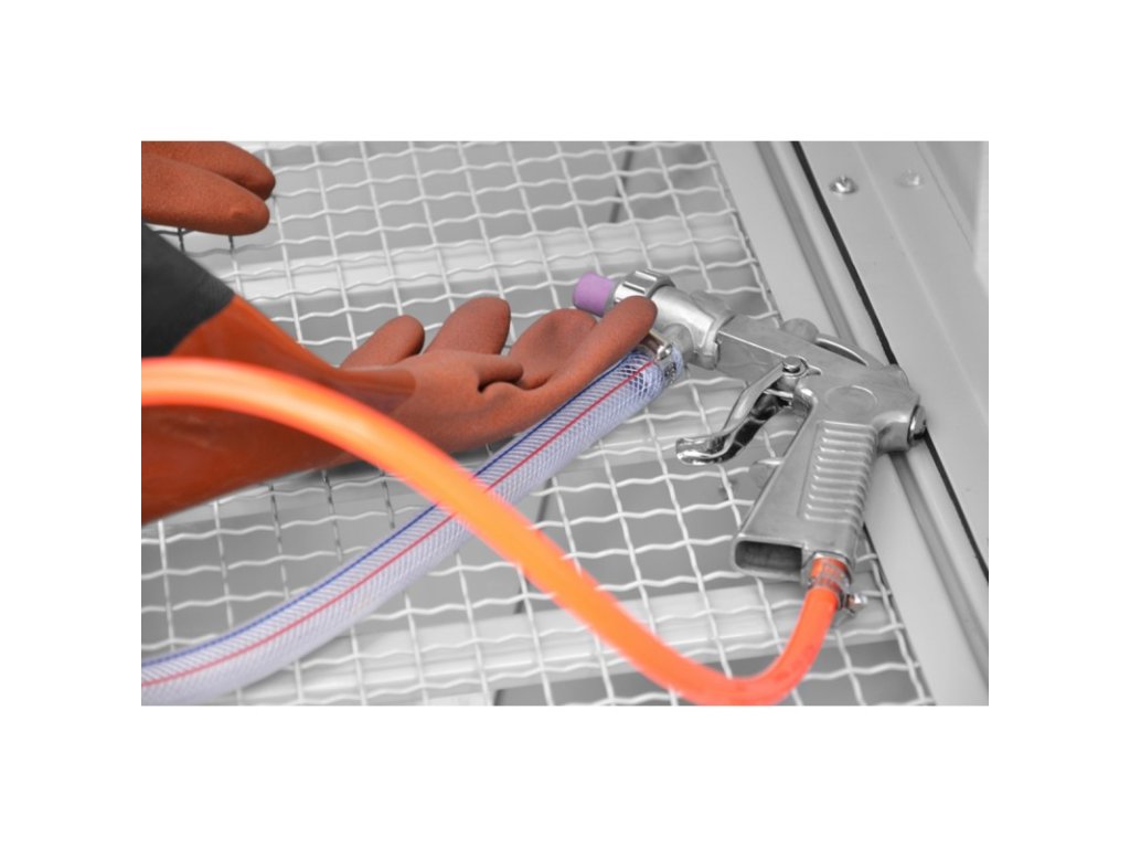 - Pískovací hadice umístěna na dně sběrné nádoby