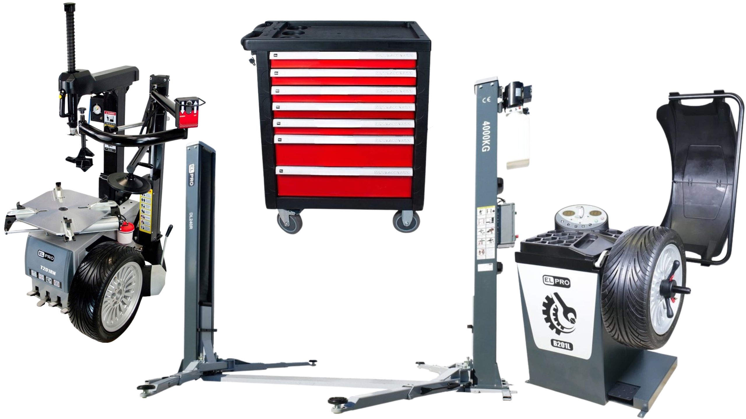 Automatická 2-rýchlostná prezúvačka T201.RN2V s ramenom RunFlat + Automatická vyvažovačka kolies B201L + Automatický dvojstĺpový zdvihák DL240 190 cm zdvih + Vozík na náradie, dielenská skriňa 420el