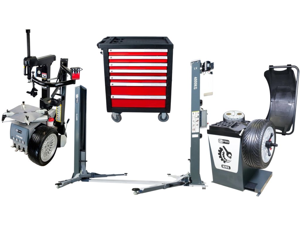 Automatická 2-rýchlostná prezúvačka T201.RN2V s ramenom RunFlat + Automatická vyvažovačka kolies B201L + Automatický dvojstĺpový zdvihák DL240 190 cm zdvih + Vozík na náradie, dielenská skriňa 420el