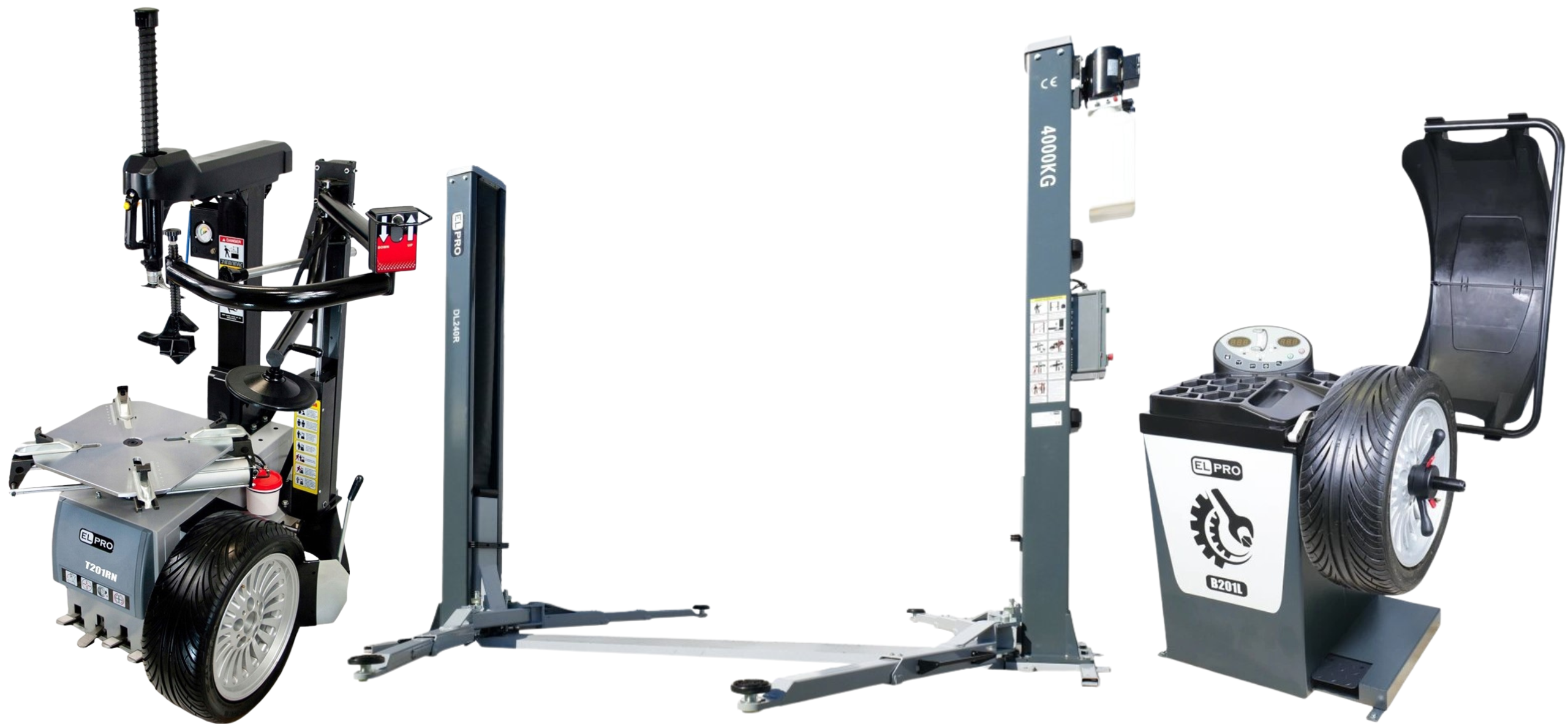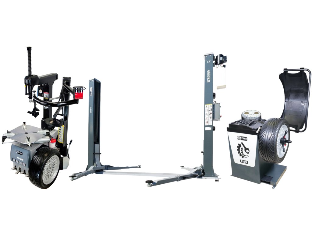 Automatická 2-rýchlostná prezúvačka T201.RN2V s ramenom RunFlat + Automatická vyvažovačka kolies B201L + Automatický dvojstĺpový zdvihák DL240 190 cm zdvih