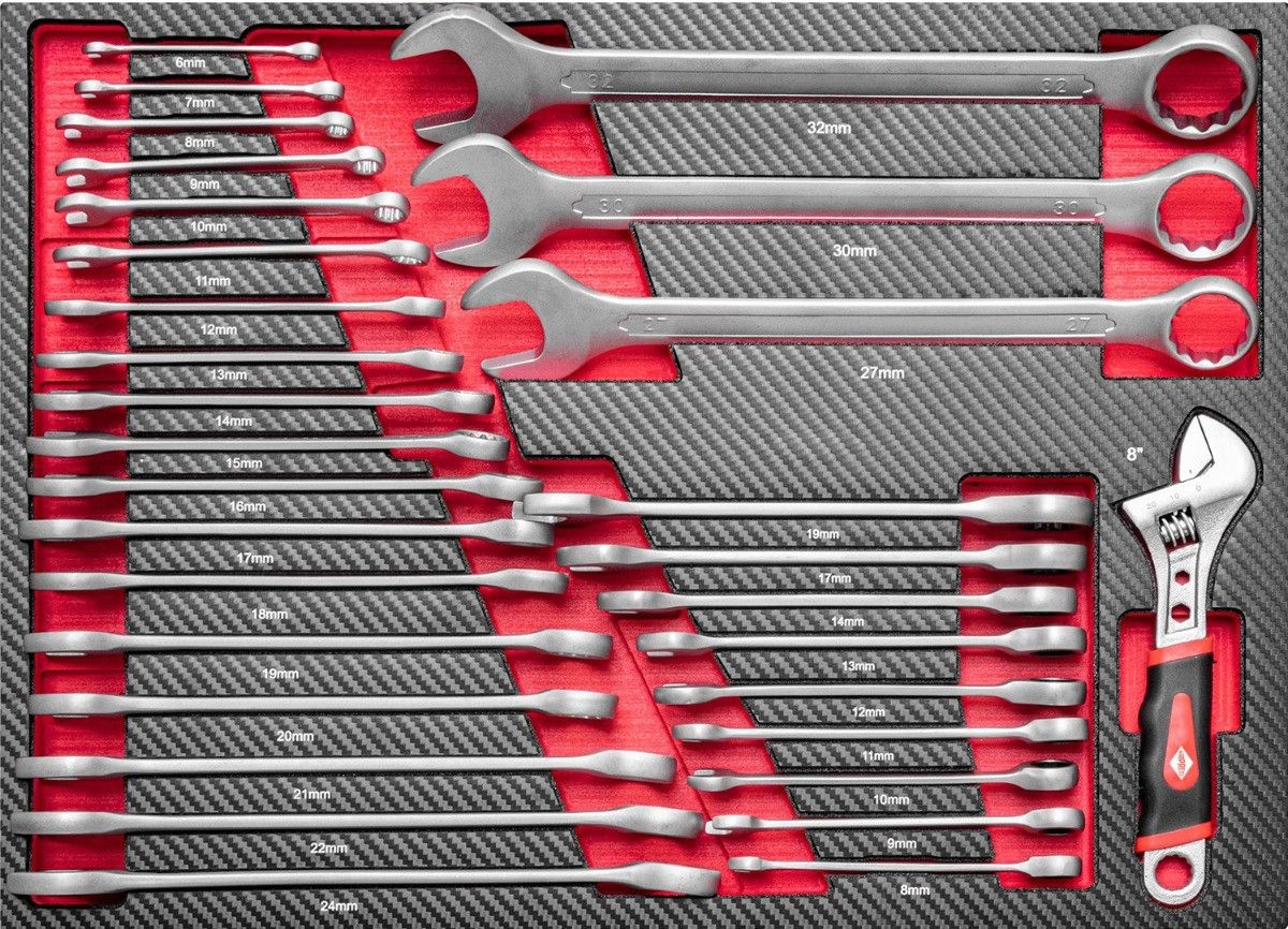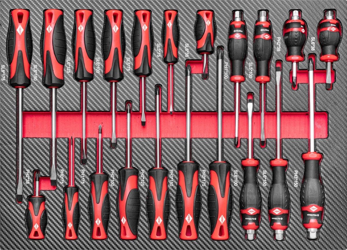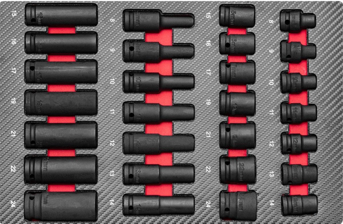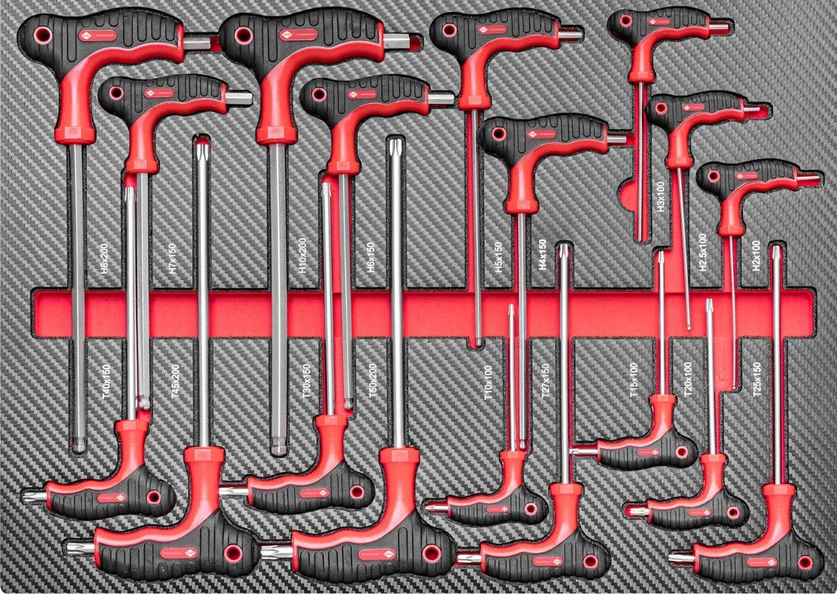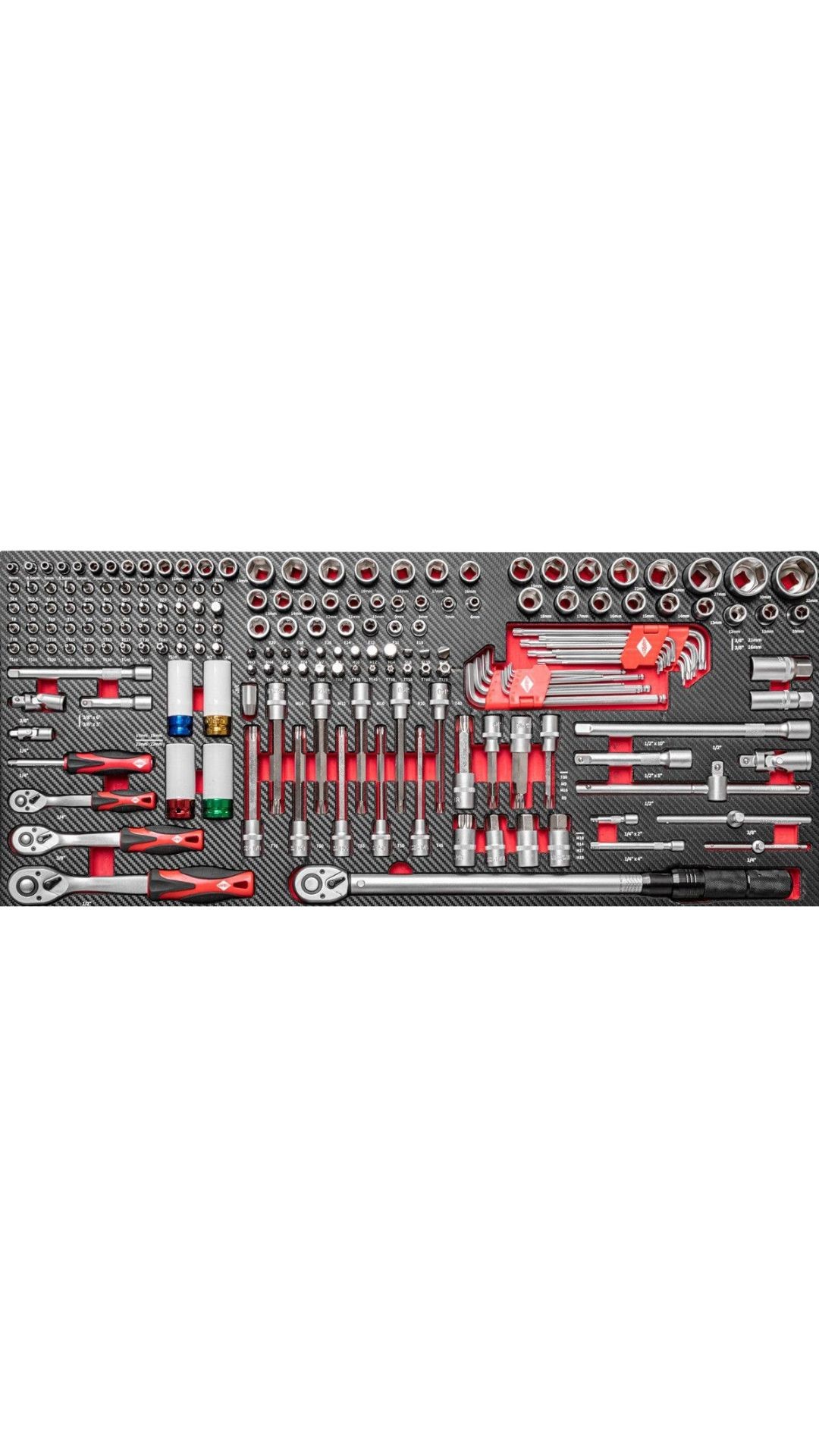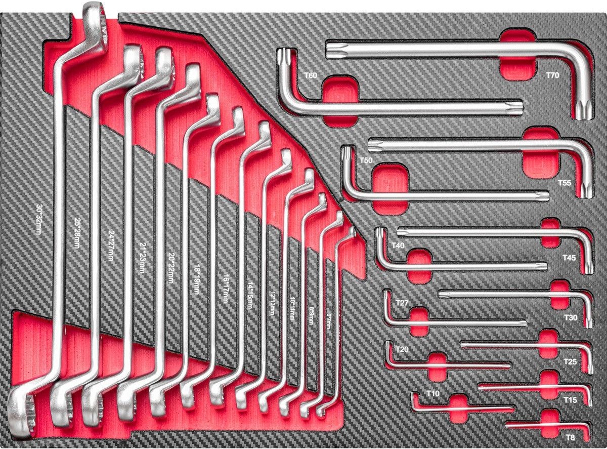 ✅ Všechny nástroje jsou uloženy ve speciálních pěnových vložkách pokrytých vrstvou polykarbonátu odolných vůči oleji. Moduly nářadí se snadno čistí a jsou mimořádně odolné bez ohledu na pracovní podmínky, se kterými se setkáte! Každý prvek modulu je označen dalšími symboly, které vám umožňují rychle a efektivně najít správný nástroj a pomáhají udržovat pořádek na vašem pracovišti.