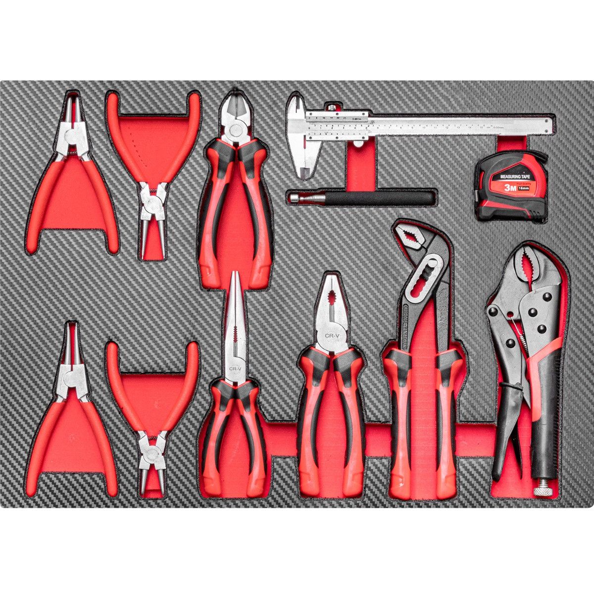 ✅ Vozík na nářadí je vybaven 11 sadami nářadí v praktických modulech. Všechny nástroje jsou vyrobeny z vysoce kvalitních materiálů – převážně z chrom-vanádové oceli, některé z uhlíkové oceli. Díky tomu jsou tyto nástroje dokonale vhodné pro náročné dílenské podmínky a vyznačují se nadprůměrnou odolností.