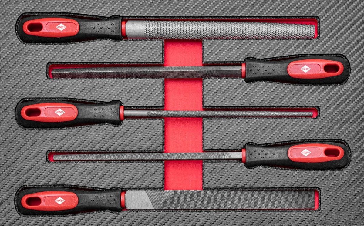 - ⏩5-dílná sada pilníků – včetně plochých, půlkruhových, kulatých, trojúhelníkových a čtvercových pilníků