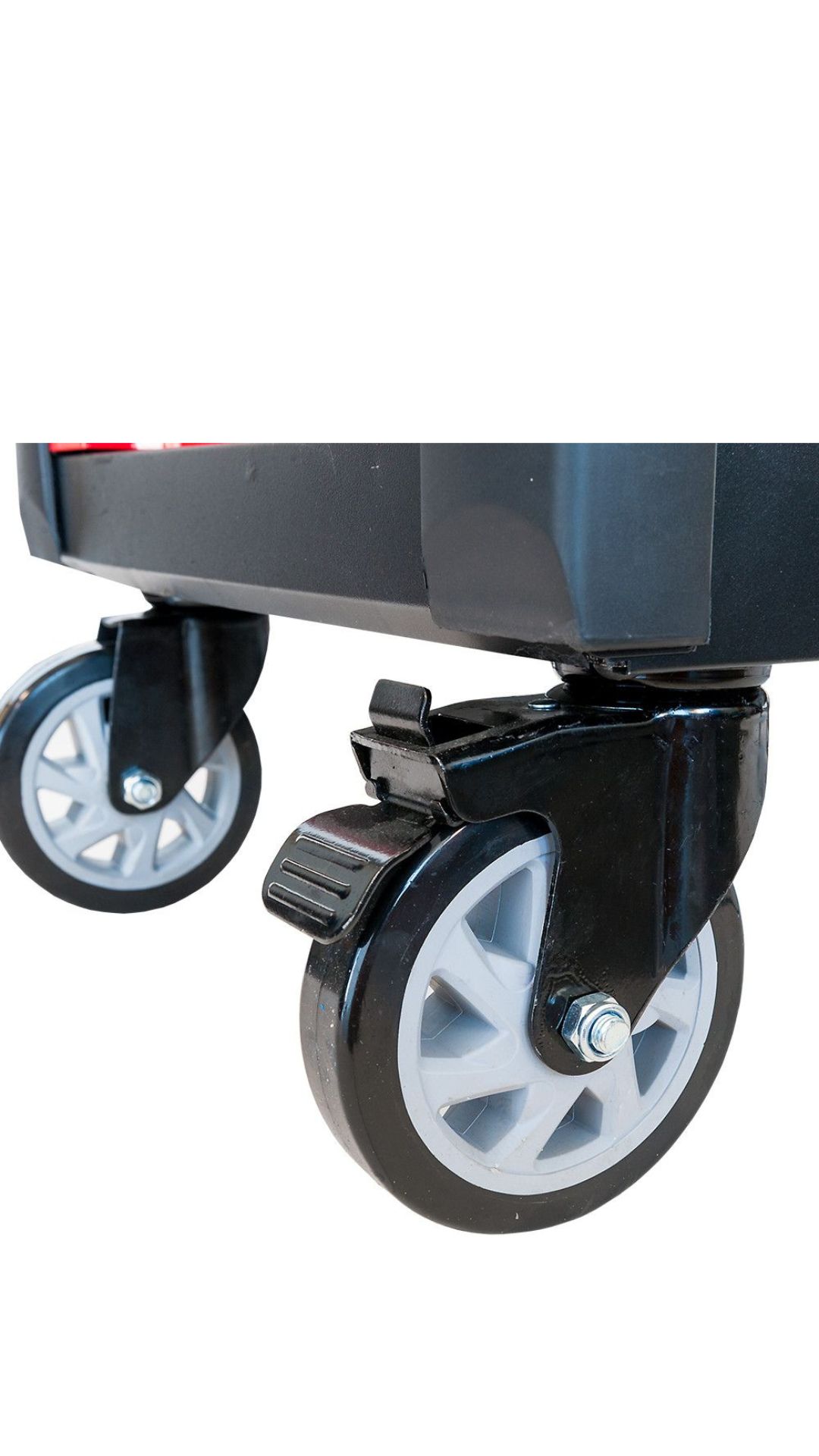 ✅Dvě kola s brzdami zaručují naprostou stabilitu během provozu, což umožňuje vozíku sloužit jako mobilní stanice na nářadí i jako stabilní místo pro odkládání vybavení.