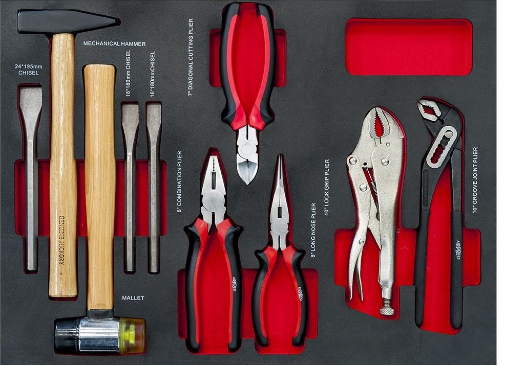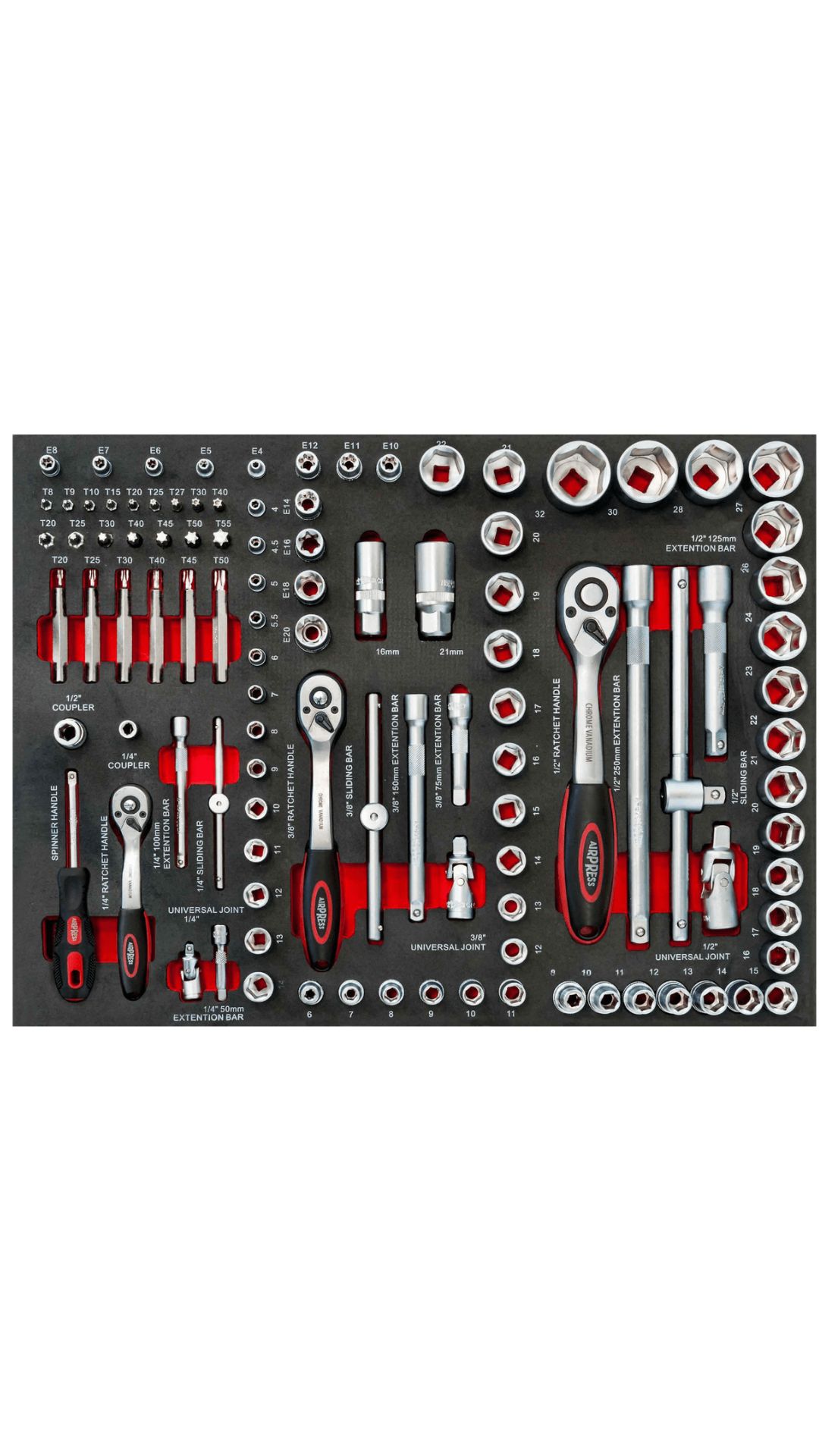 ✅Každý modul nářadí je umístěn ve speciálních pěnových vložkách, které jsou pokryty vrstvou polykarbonátu odolného vůči oleji, což zajišťuje snadné čištění a dlouhou životnost. Označení vedle každého komponentu usnadňuje rychlé nalezení správného nářadí a udržování pořádku.