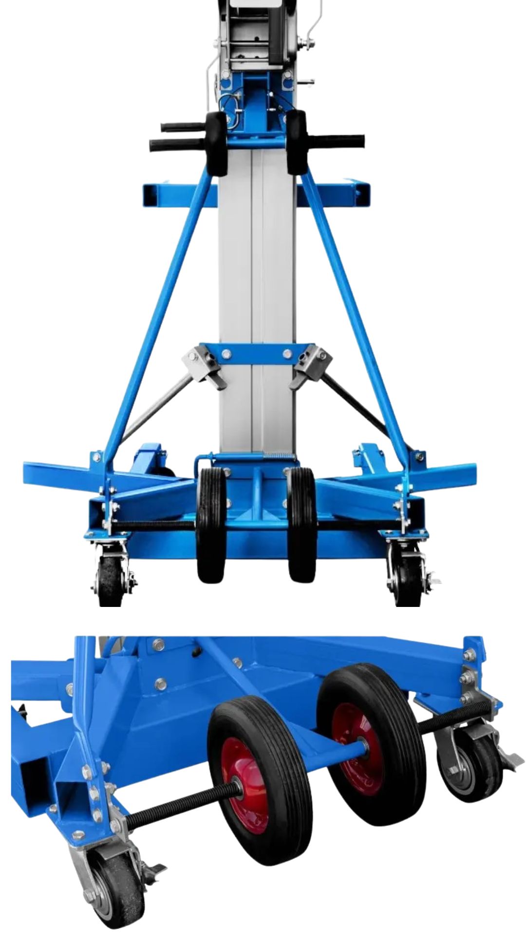 ✅ Tento model je navržen pro odolnost a bezpečnost při vysokém zatížení. Jeho robustní ocelový rám a teleskopický stožár umožňují plynulé zvedání břemen až do výšky 6500 mm bez rizika deformace. Stabilní základna s nastavitelnými podpěrami a samonastavovacím systémem kol usnadňuje pohyb a rychlou montáž zvedacího zařízení.
