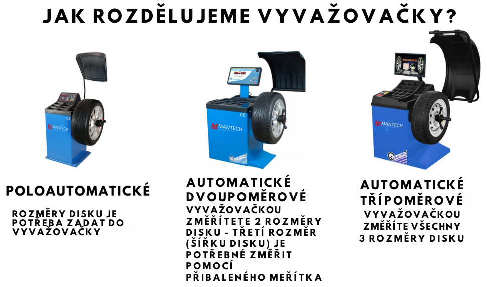 - Automatická nebo poloautomatická vyvažovačka kol - Automatická vyvažovačka kol změří rozměry pomocí přiložených meráků a do poloautomatické je potřeba zadat poměry ručně. Automatická vyvažovačka kol se dále rozděluje podle toho, zda změří 2 poměry kol - třetí poměr šířku kola je potřeba změřit pomocí meráku (toto jsou vyvažovačky Mantech KW 950, Mantech KW 920, Mantech KW 910, Mell monkey 400, Grubber EM740) nebo všechny tři poměry kola i šířku. (Mantech KW 663, Mantech KW971, Grubber EM905, MELL monkey 500).