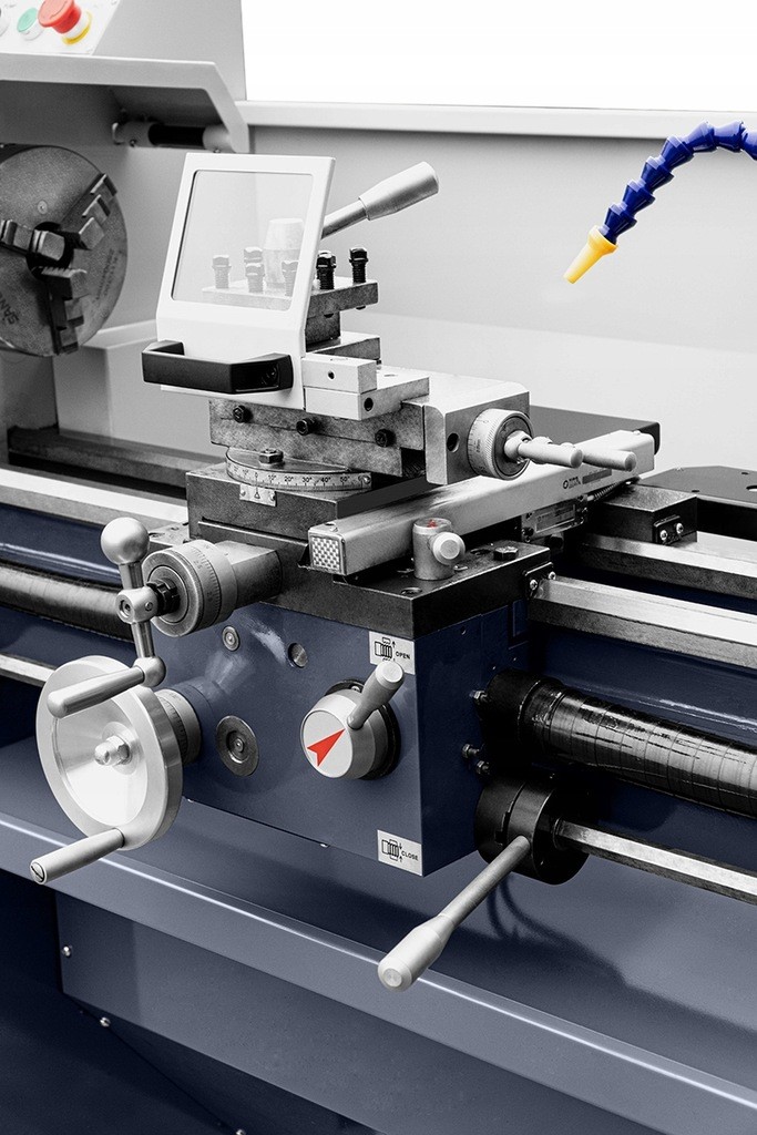 Digitální odečet ve dvou osách podélného a příčného pohybu suportu. Zpracovaný elektronický signál z optických pravítek vizualizuje získané hodnoty z pohybů podél os na digitální obrazovce.- Indukční motor (konstantní otáčky) 1,1 kW/400 V pohon s vysokým výkonem a vysokým točivým momentem, optimálně vhodný pro obrábění oceli a neželezných materiálů.