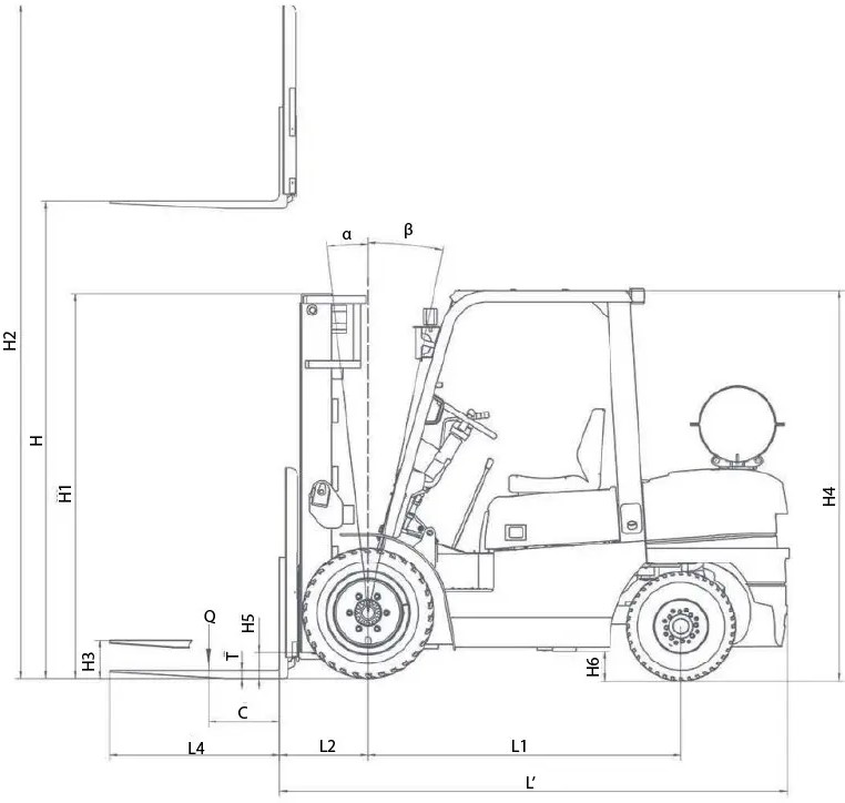 - Celková délka vozíku (bez vidlic): 2580 mm /L’/